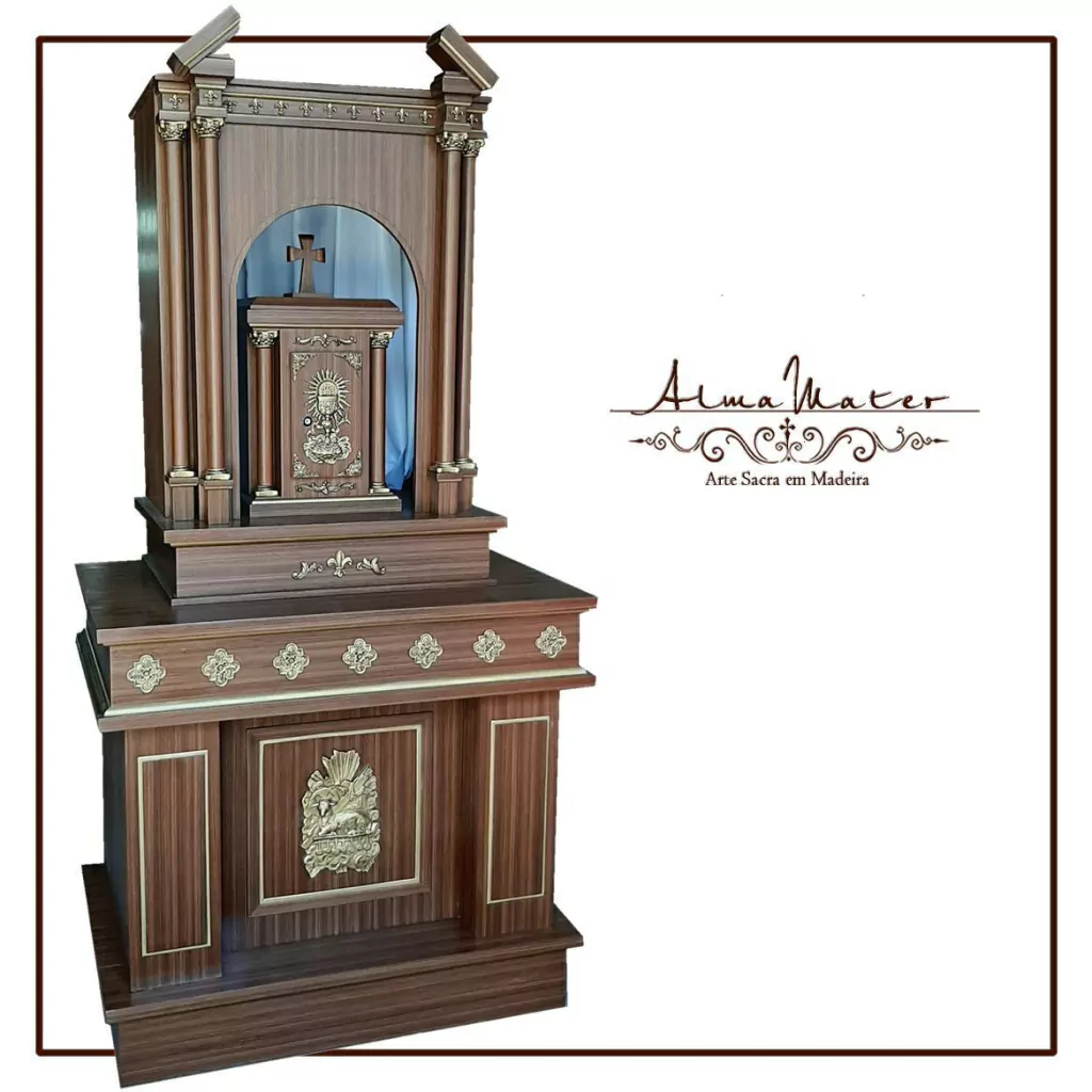 Altar de parede (sem fundo) confeccionado em compensado virola imunizado, revestido por lâmina pré-composta e acabamento em verniz. Apliques em resina marmorizada com pintura especial dourada.