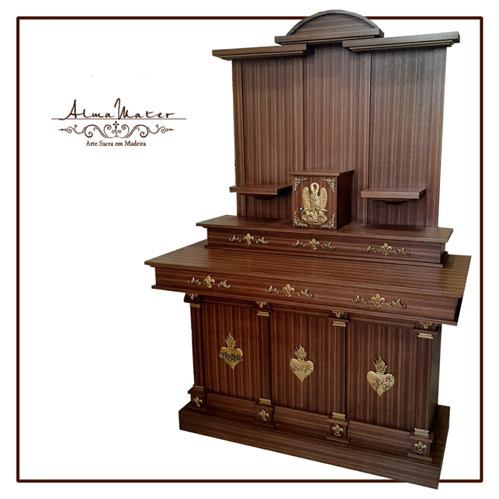Altar de parede (sem fundo) confeccionado em compensado virola imunizado, revestido por lâmina pré-composta e acabamento em verniz. Apliques em resina marmorizada com pintura especial dourada.