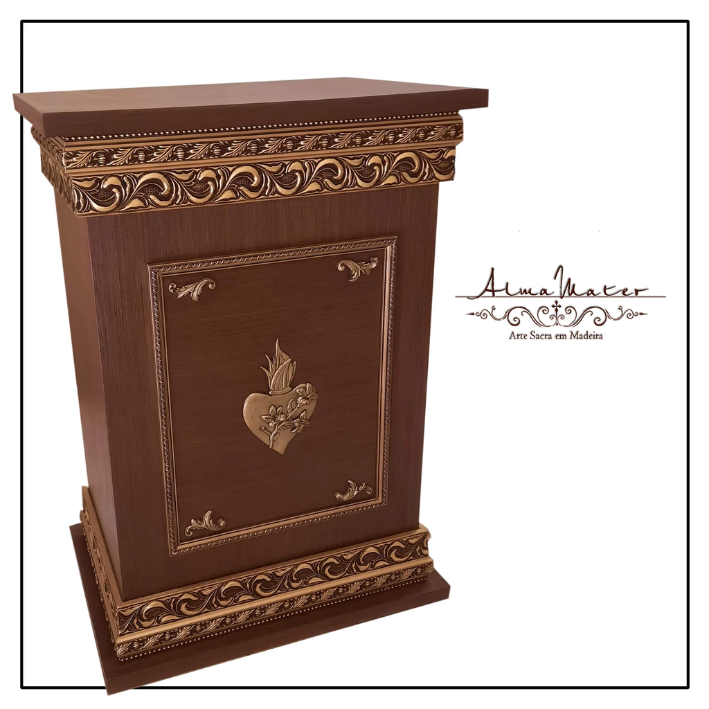 Suporte de chão para imagem, sacrário, etc. Confeccionado em compensado virola imunizado revestido por lâmina pré-composta e acabamento em verniz.