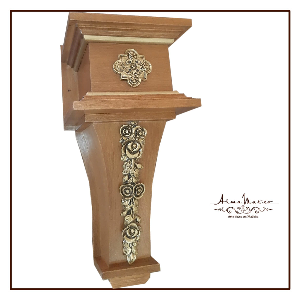 Confeccionada em compensado virola imunizado, revestido por lâmina pré-composta e acabamento em verniz. Apliques em resina marmorizada com pintura especial dourada.