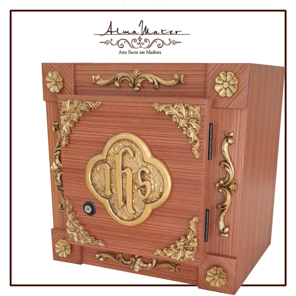 Confeccionado em compensado virola imunizado, revestido por lâmina pré-composta e acabamento em verniz. Apliques em resina marmorizada com pintura especial dourada. Revestimento interno em tecido brocado litúrgico acolchoado.