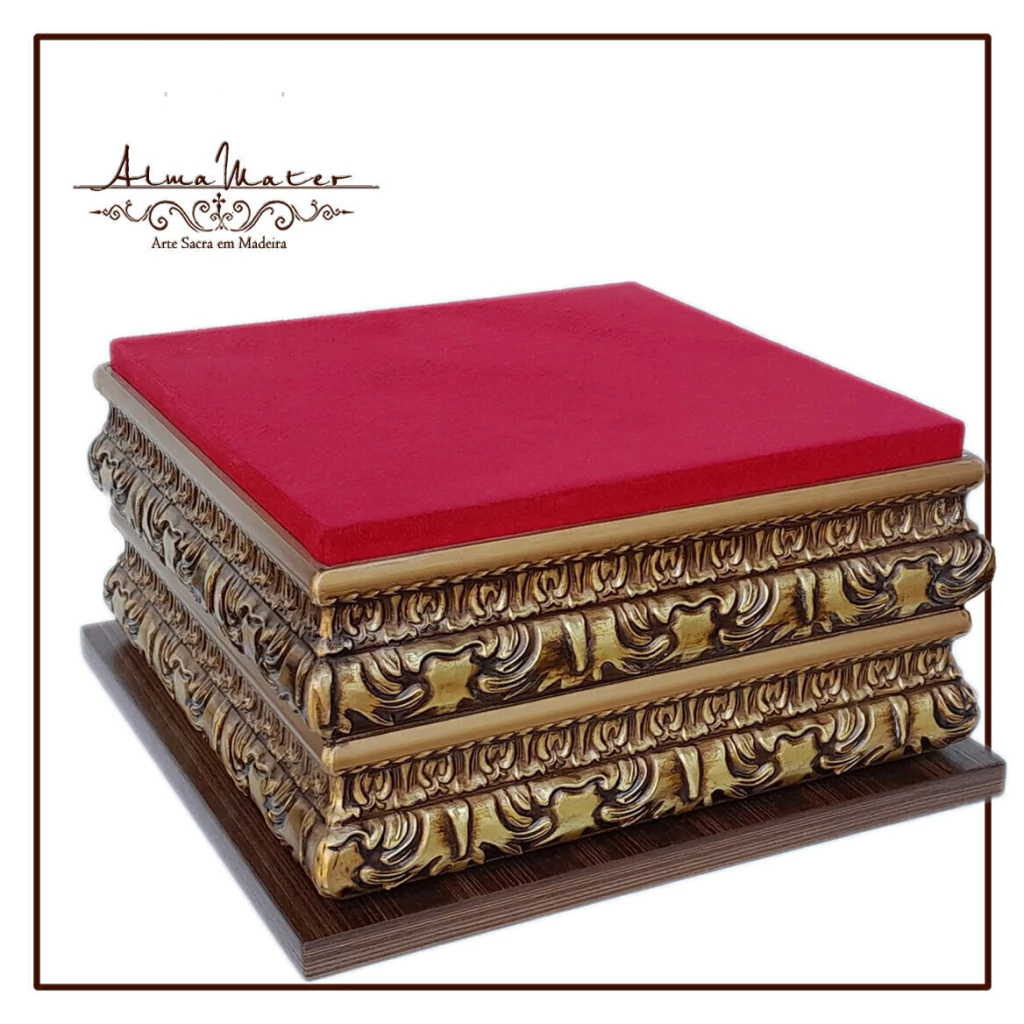 Confeccionado em compensado virola imunizado, revestido por lâmina pré-composta e acabamento em verniz. Molduras em madeira. Tampo revestido em tecido aveludado.