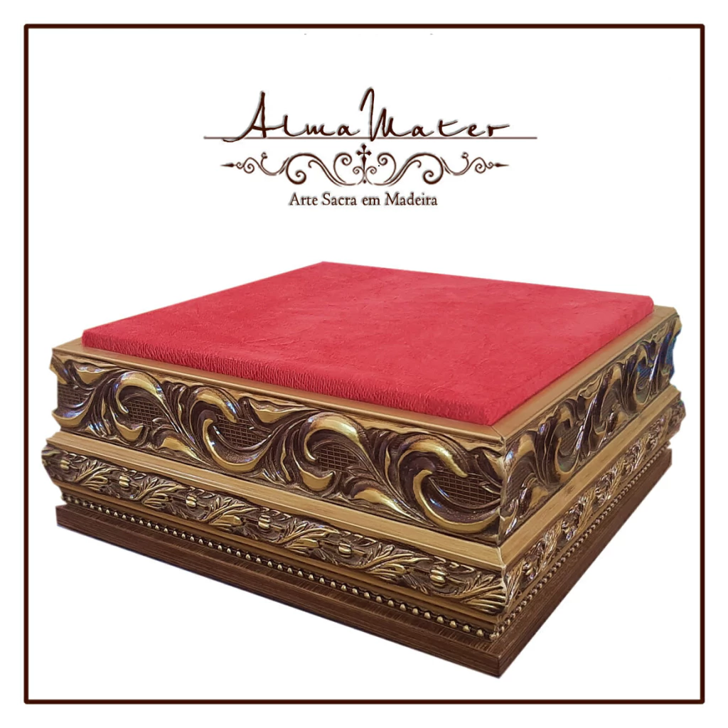 Confeccionado em compensado virola imunizado, revestido por lâmina pré-composta e acabamento em verniz. Molduras em madeira. Tampo revestido em tecido aveludado.
