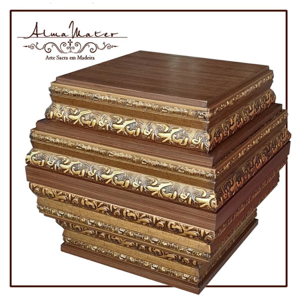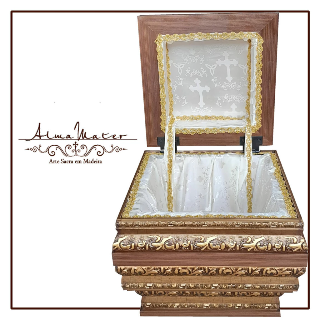Confeccionado em compensado virola imunizado, revestido por lâmina pré-composta e acabamento em verniz. Revestimento interno em tecido brocado litúrgico acolchoado.